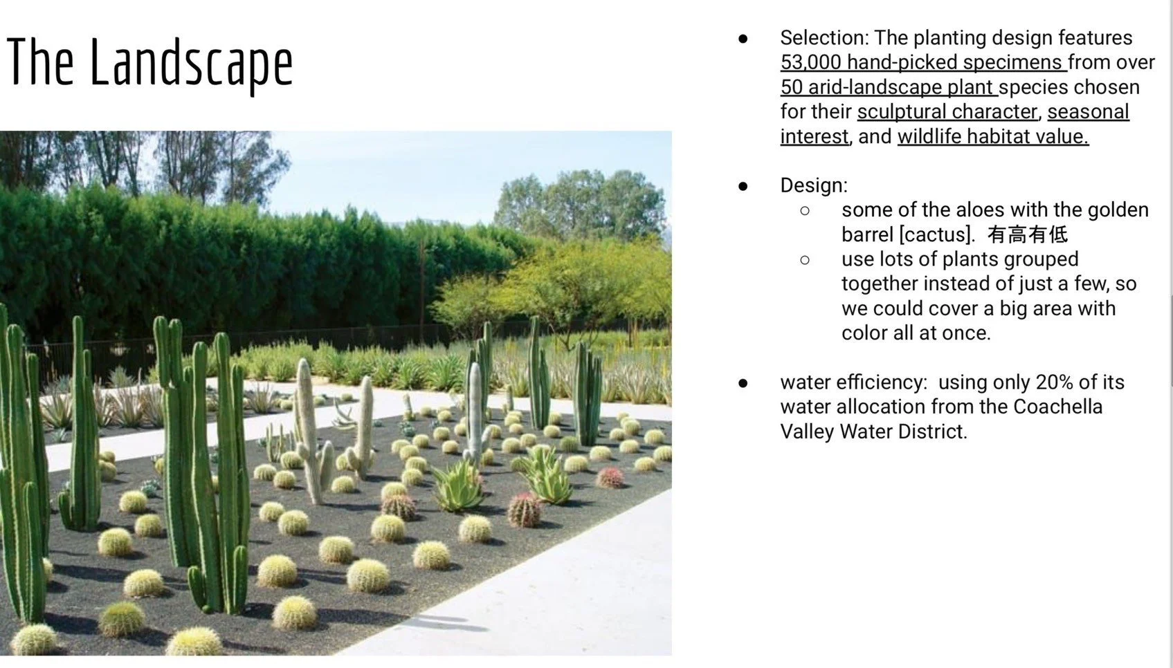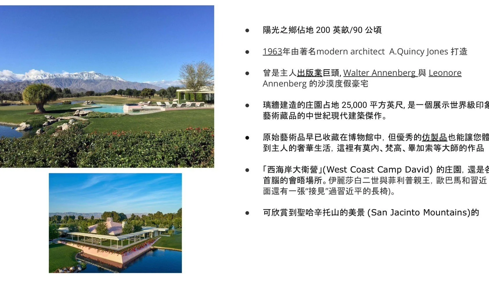 隨後參觀了素有“西海岸大衛營” 之稱的Sunnylands Center and Garden,一座由著名建築師 A.Quincy Jones 打造的當代建築傑作,也是多國首腦的會晤場所。陽光燦爛,大家漫步在 池水、垂柳、光影的沙漠花園中,彷彿進入了印象派梵谷,和莫內畫裡。